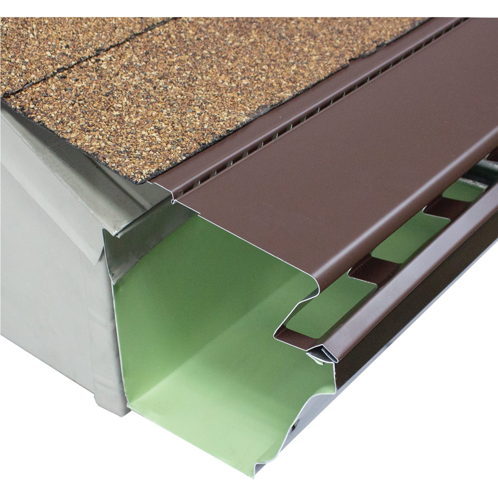 Leafproof® is a solid aluminum gutter cover that installs over existing gutters without penetrating your roof. The patented “S-Bend” slows the flow of rainwater, causing the water to adhere to the Leafproof® panel. The Leafproof® System can be installed on any type of roofing, including shingles, slate, metal and tile, and on any roof pitch. Leafproof® features small ¼-inch water channel opening that leaves gutters virtually impenetrable and is designed to work with Leafproof endcaps (sold separately) that prevent small animals and birds from entering and nesting. It is installed under the first row of shingles and it does not use screws or nails in the roof.